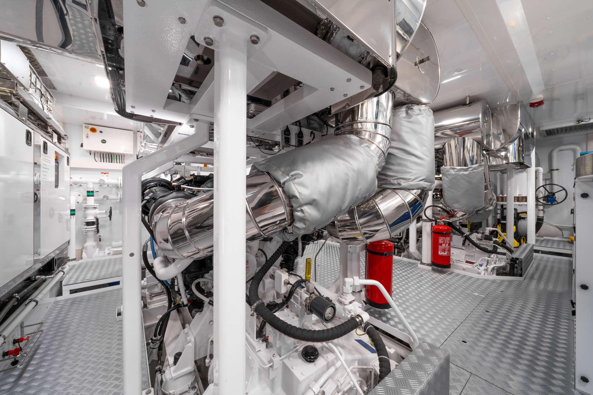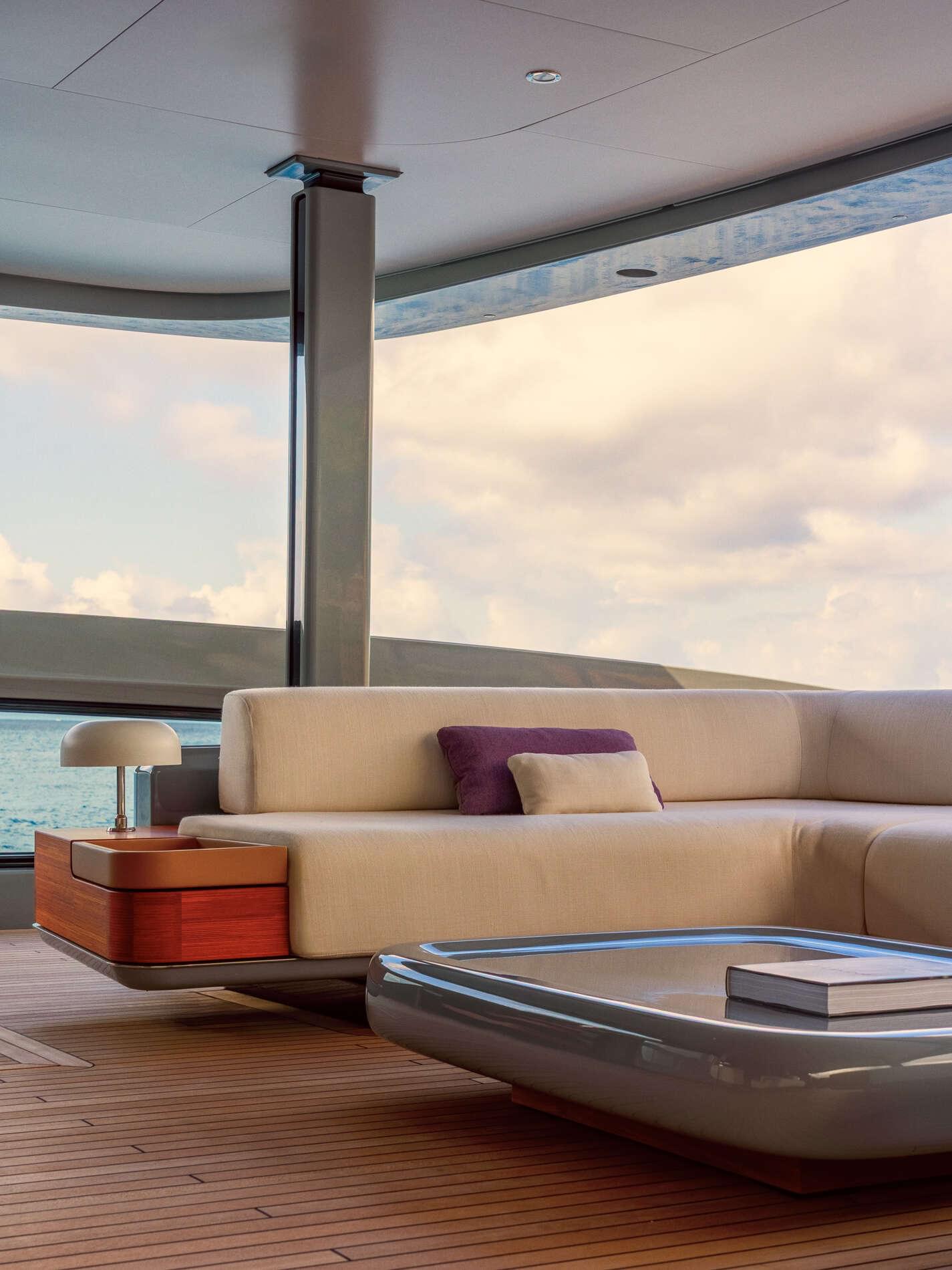The exterior of RJ impressed the judges with its logical deck layout, proportional balance, and exceptional build quality. As one judge remarked: "She has the true explorer capabilities of the CdM but with the appearance of a white ship. She has a certain elegance." Notable details include the fashion plates extending up the superstructure to the hardtop and the glass panel bulwarks. RJ is the fourth yacht in the RJ series, following RJ 130 Nuri and the RJ 115s Stellamar and Pazienza, and is the longest yacht ever built by Cantiere delle Marche.