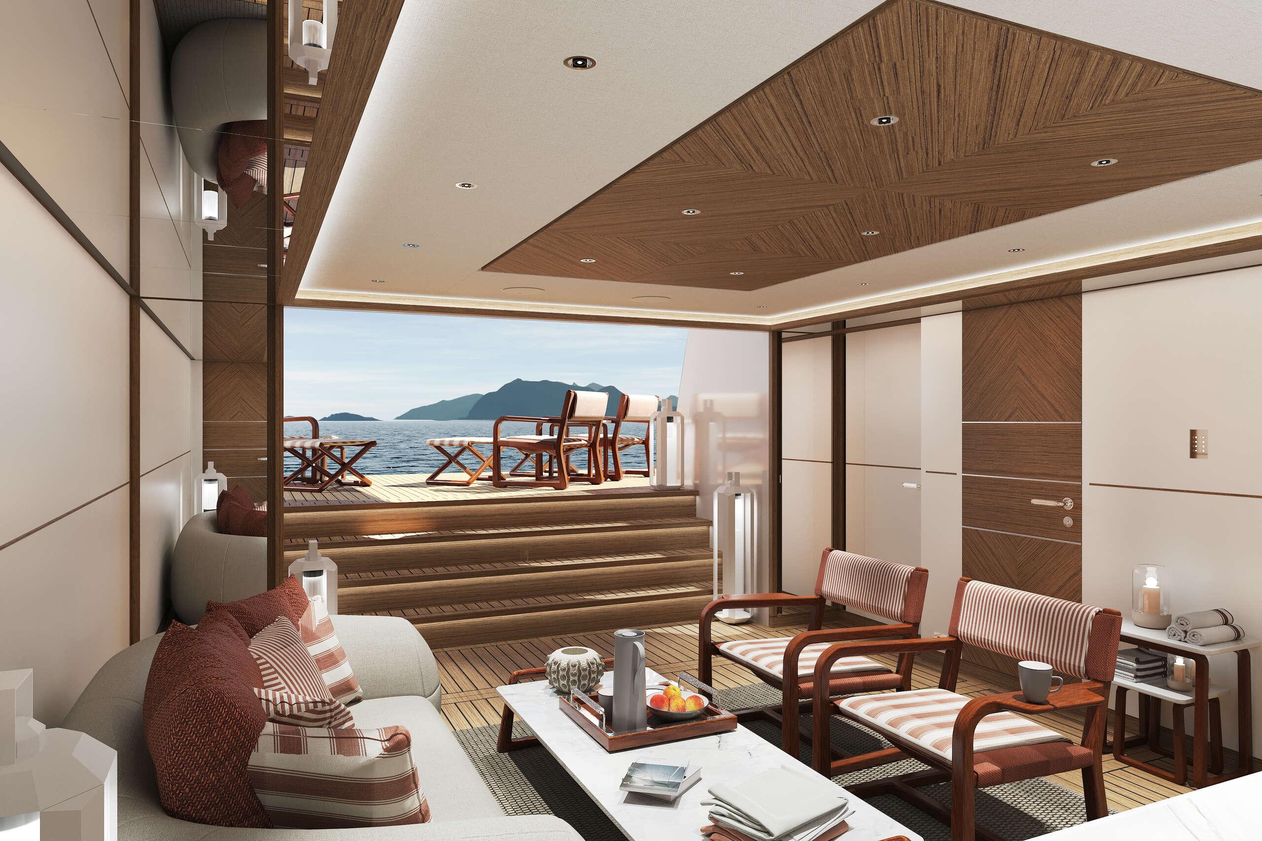 Project Frida features exterior design by Omega Architects, distinguished by a 'shark tooth' superstructure and floor-to-ceiling windows. The interior, designed by Luca Dini Design and Architecture, harmonises expansive, light-filled spaces with natural wengé wood, creating timeless elegance. Her ultra-stable, fuel-efficient hull delivers comfort across the speed range, complemented by zero-speed and on-the-go stabilisers.