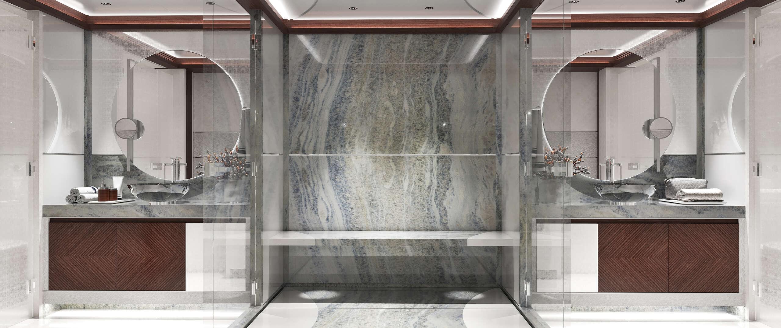 The 760 GT interior volume accommodates 12 guests in 6 staterooms. The full-beam owner's apartment includes a study, luxurious bathroom with Calcite Blue stone, and a private veranda. Four guest suites are on the lower deck, with a versatile fifth cabin on the bridge deck. The interior showcases exceptional craftsmanship from Heesen Yachts Interiors, the in-house luxury furniture workshop.