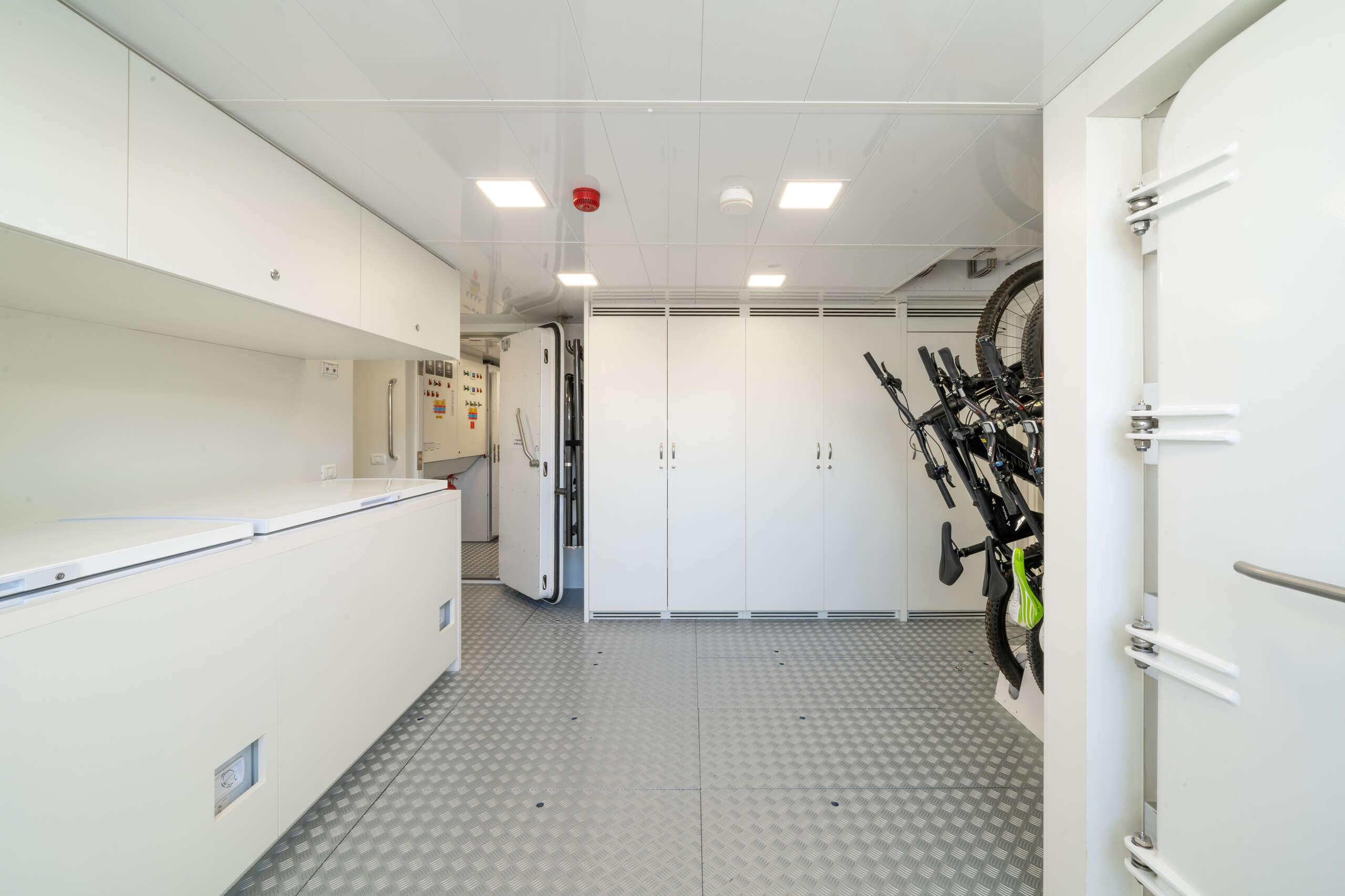 Captain Gabriele Carniglia outlined the custom technical specifications. Key owner requests included greater autonomy, higher cruising speeds with low consumption, large storage and refrigeration, a potable water purification system, and advanced waste management.