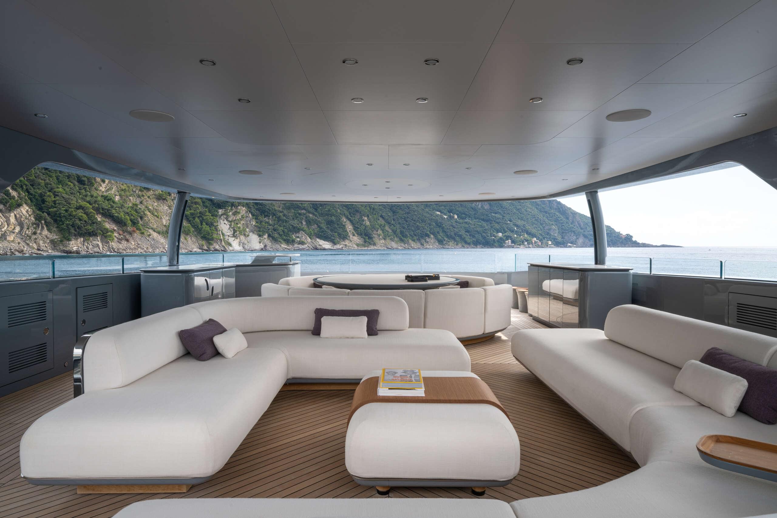 The yacht's spaces are seamlessly connected. The Sun Deck is an expansive, mostly shaded open-air area with a forward bar. The Upper Deck features an aft dining terrace, a forward panoramic lounge, and the wheelhouse. The Main Deck hosts the main saloon, owner's apartment with a large gym, and a spacious galley. The Lower Deck accommodates four guest suites and four crew cabins.