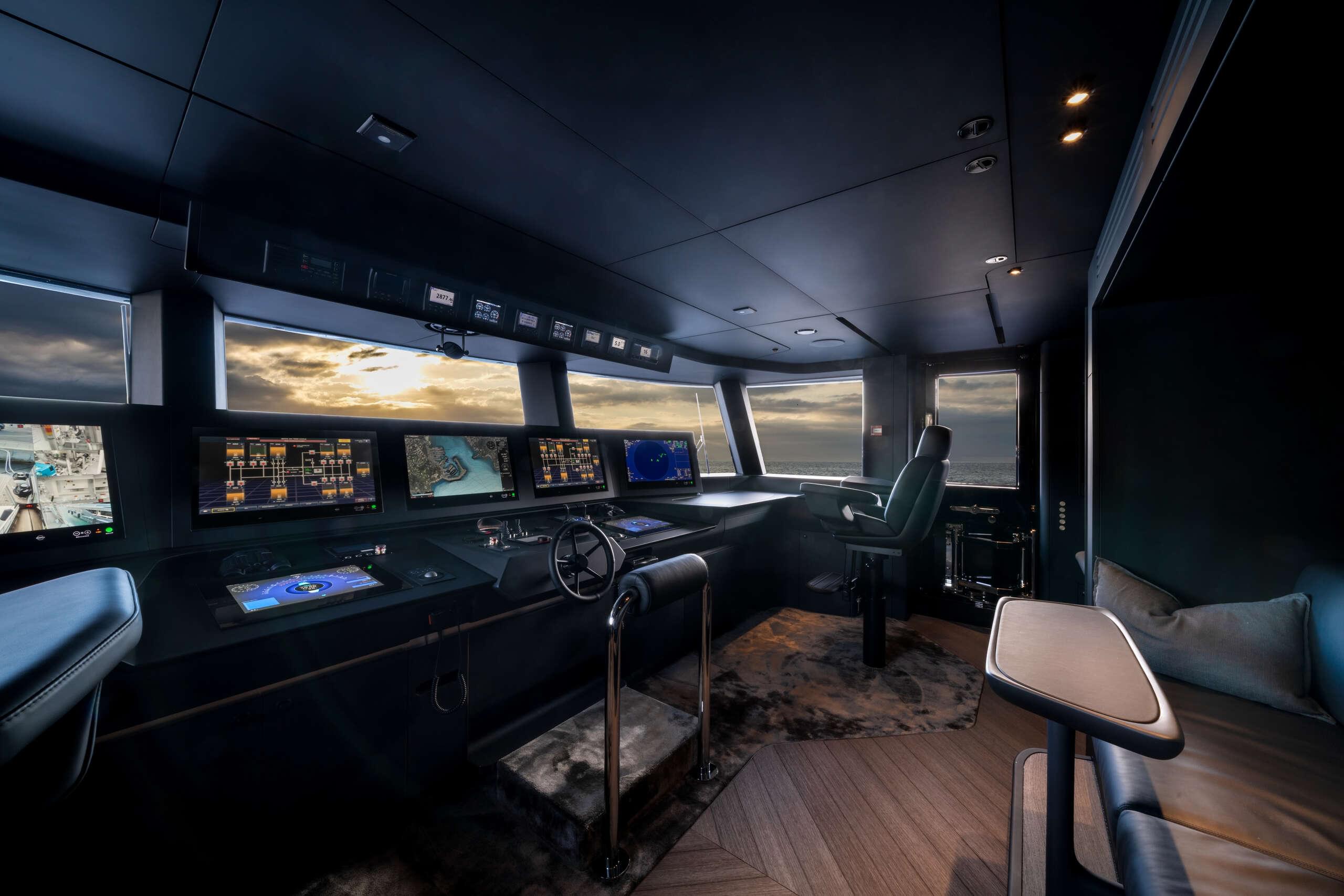The wheelhouse features a semi-integrated Furuno and Böning dashboard with a thermal camera for safety. The engine room includes a separate control room. Power comes from twin Caterpillar C32 engines (895kW each), with two 110 kW Tier 3-compliant generators, enabling a range of 5,000 nm at 10 knots from a 66,400L fuel capacity.