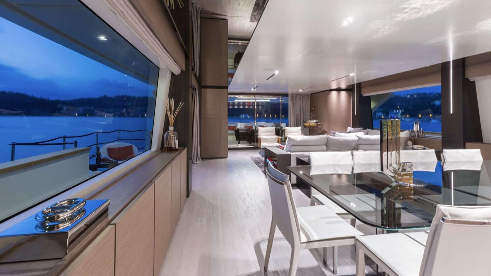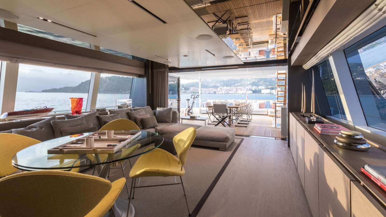 Thanks to the exterior panoramic terrace on the starboard side of the main deck and the magnificent opening windows on the stern side of the upper deck, the lounge areas and the interior and exterior dining areas are spacious and bright.